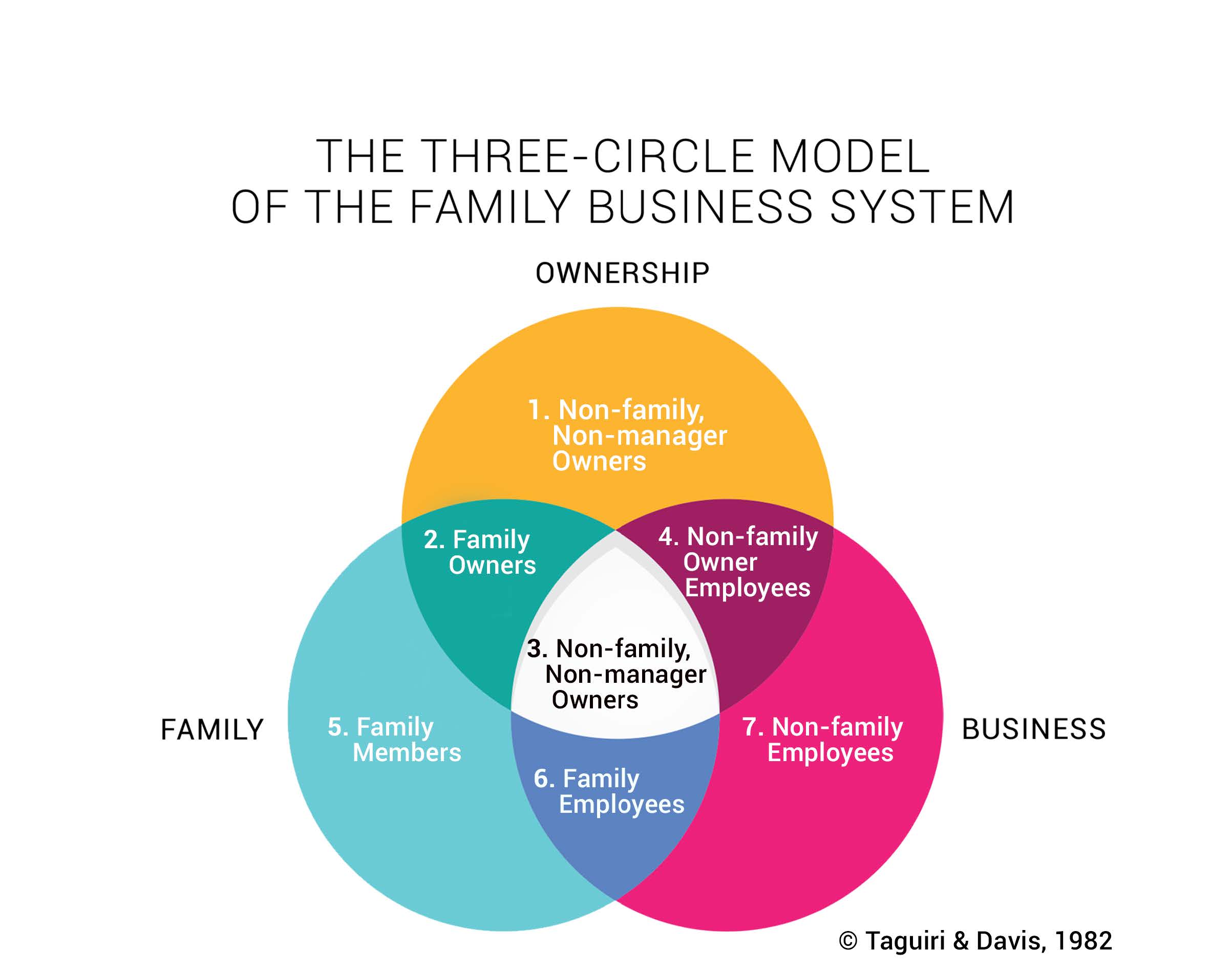This image identifies the 7 different categories of individuals involved in a family business. Each group will bring different experiences, viewpoints, and priorities to the table. It takes concerted effort to work together to achieve a reasonable outcome for all involved
