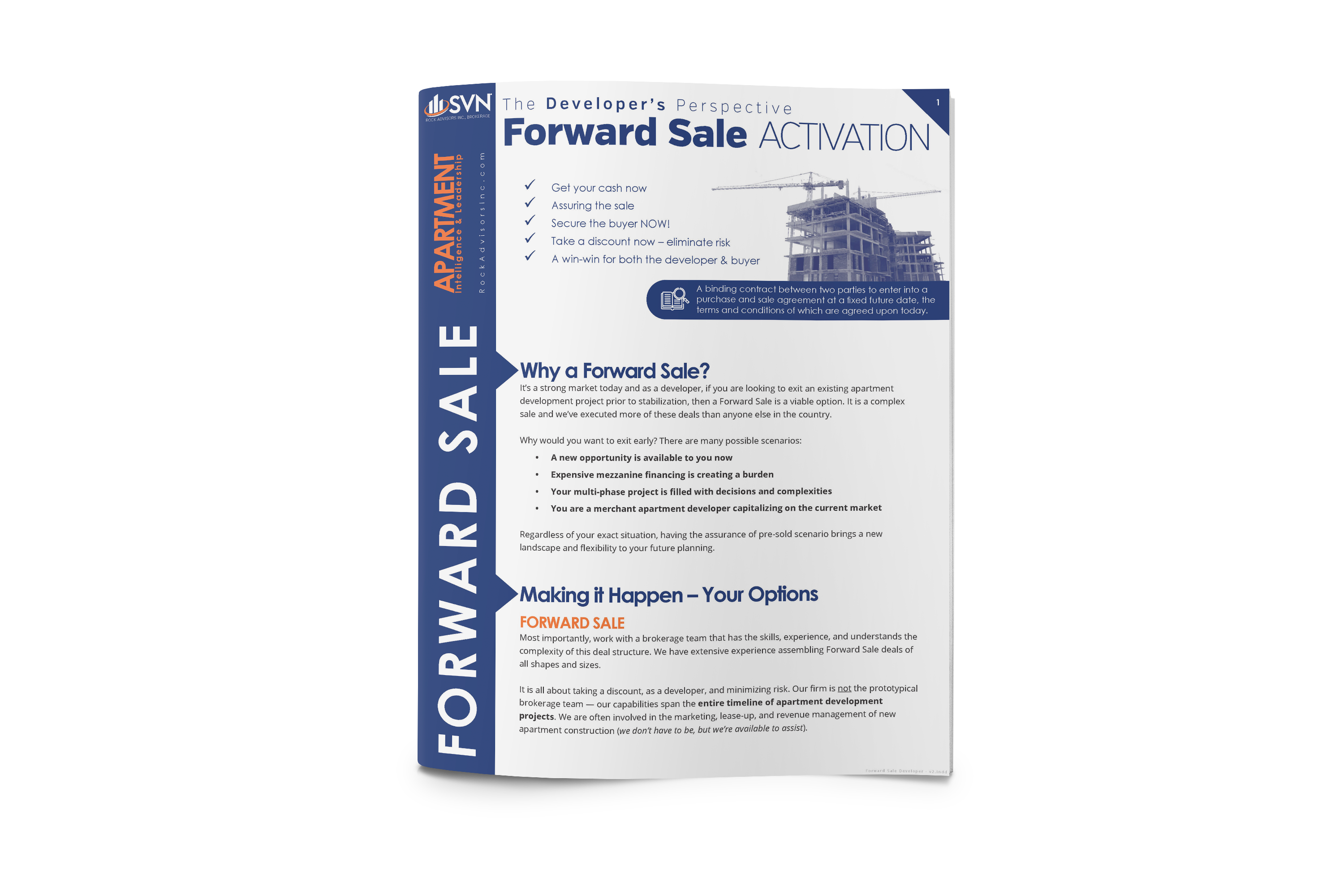 It’s a strong market today and as a developer, if you are looking to exit an existing apartment development project prior to stabilization, then a Forward Sale is a viable option. It is a complex sale and we’ve executed more of these deals than anyone else in the country.